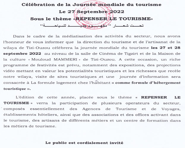 Information: Journée mondiale du tourisme, 27 Septembre 2022.