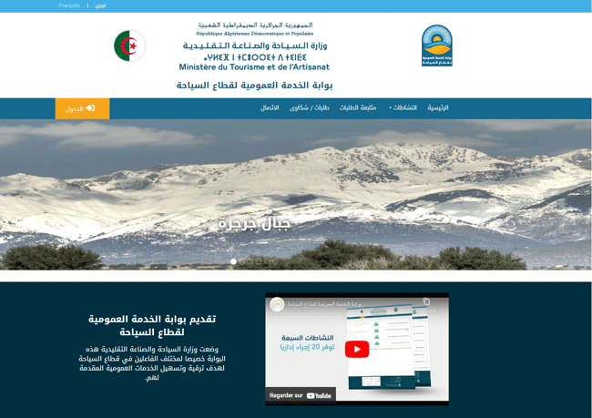 أطلقت وزارة السياحة والصناعة التقليدية بوابة الخدمة العمومية لقطاع السياحة، هذه المنصة وضعت خصيصا لمختلف الفاعلين في قطاع السياحة لهدف ترقية وتسهيل الخدمات العمومية المقدمة لهم، يمكن الاستفادة من الخدمات المقدمة من هذه المنصة عبر الرابط : https://portail.mta.gov.dz