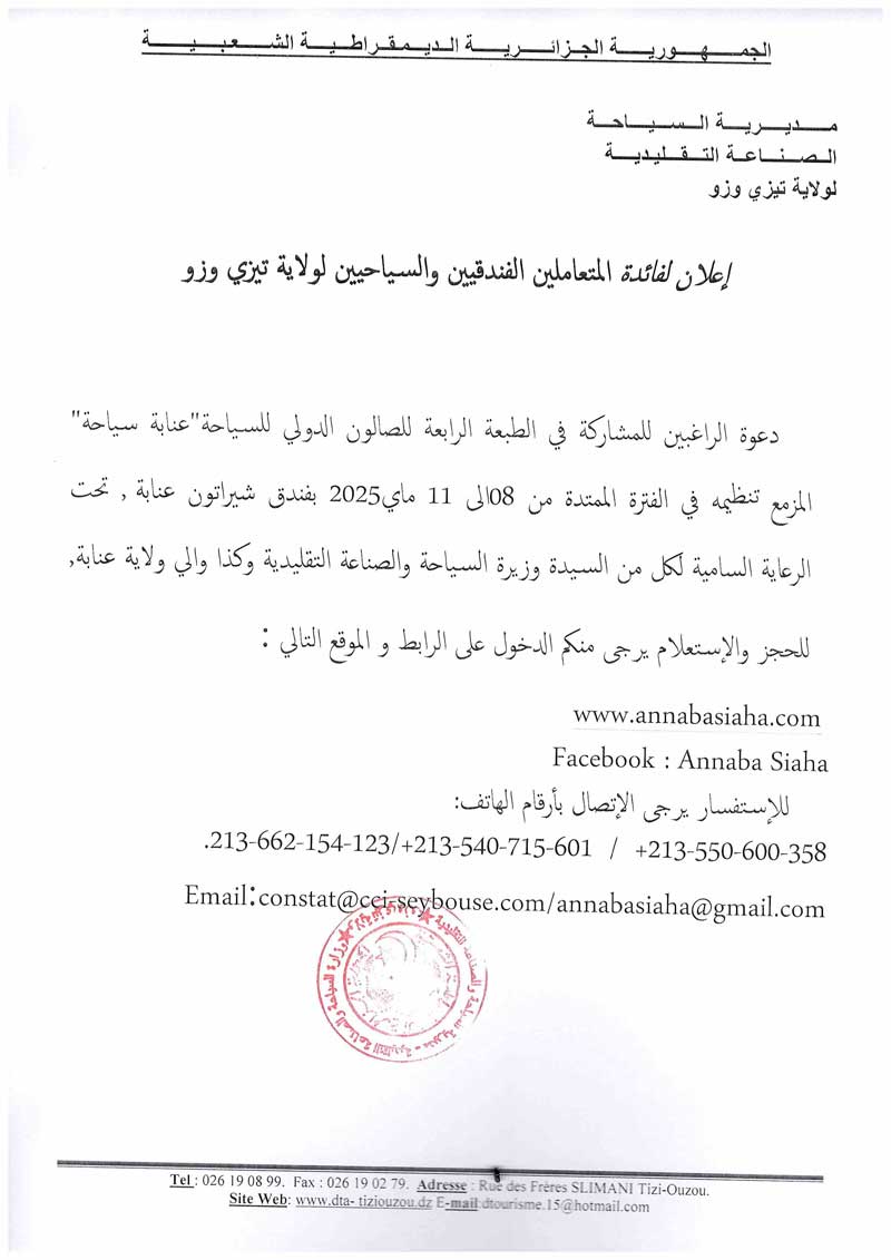 - اعلان لفائدة المتعاملين الفندقيين و السياحيين لولاية تيزي وزو