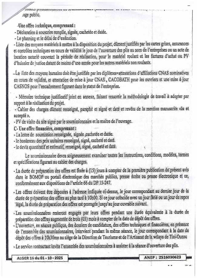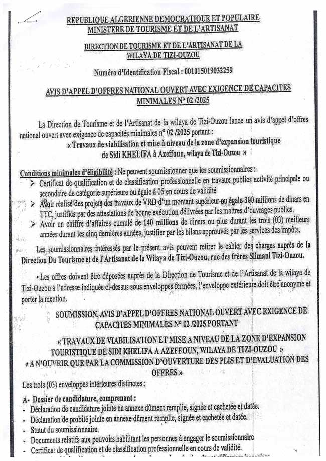 - AVIS D'APPEL D'OFFRES NATIONAL OUVERT AVEC EXIGENCE DE CAPACITE MINIMALES N° 02/2025